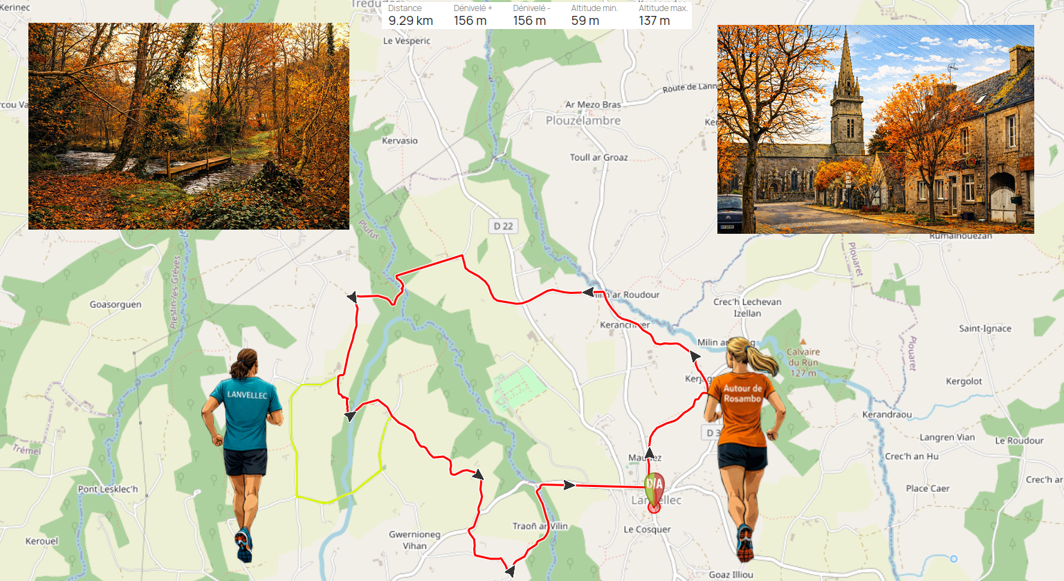 Départ près de l'église ( possible déviation sur circuit, en jaune sur la carte, à cause d'un éboulement, )
